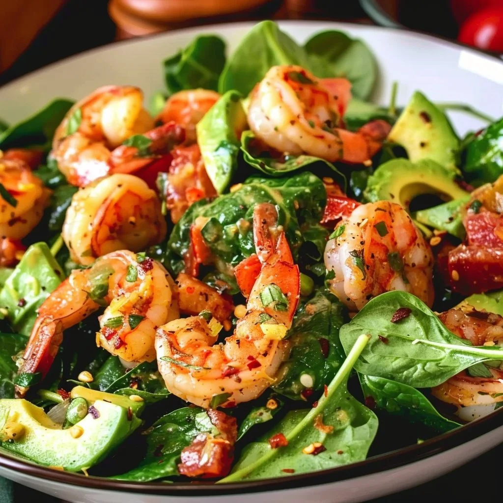 A light and fresh salad combining tender shrimp, creamy avocado, and crisp spinach, perfect for a quick meal.