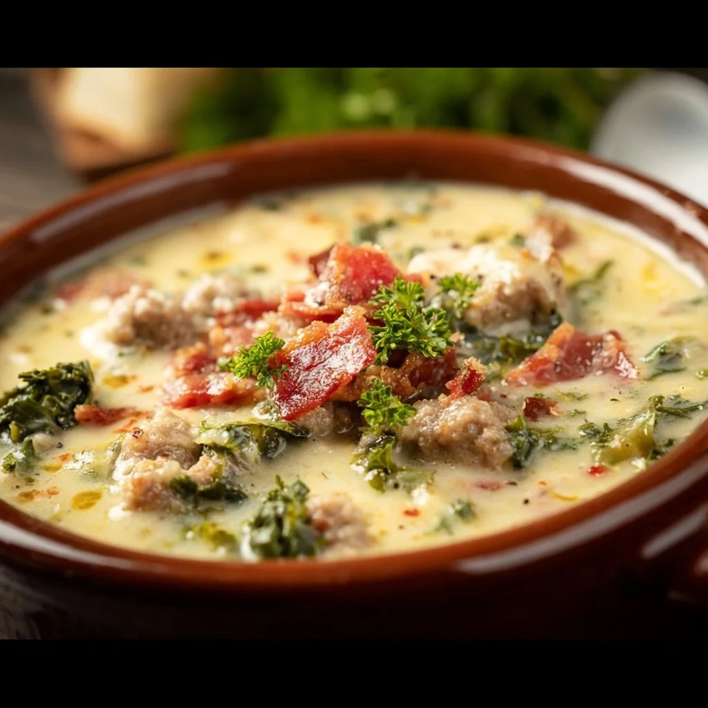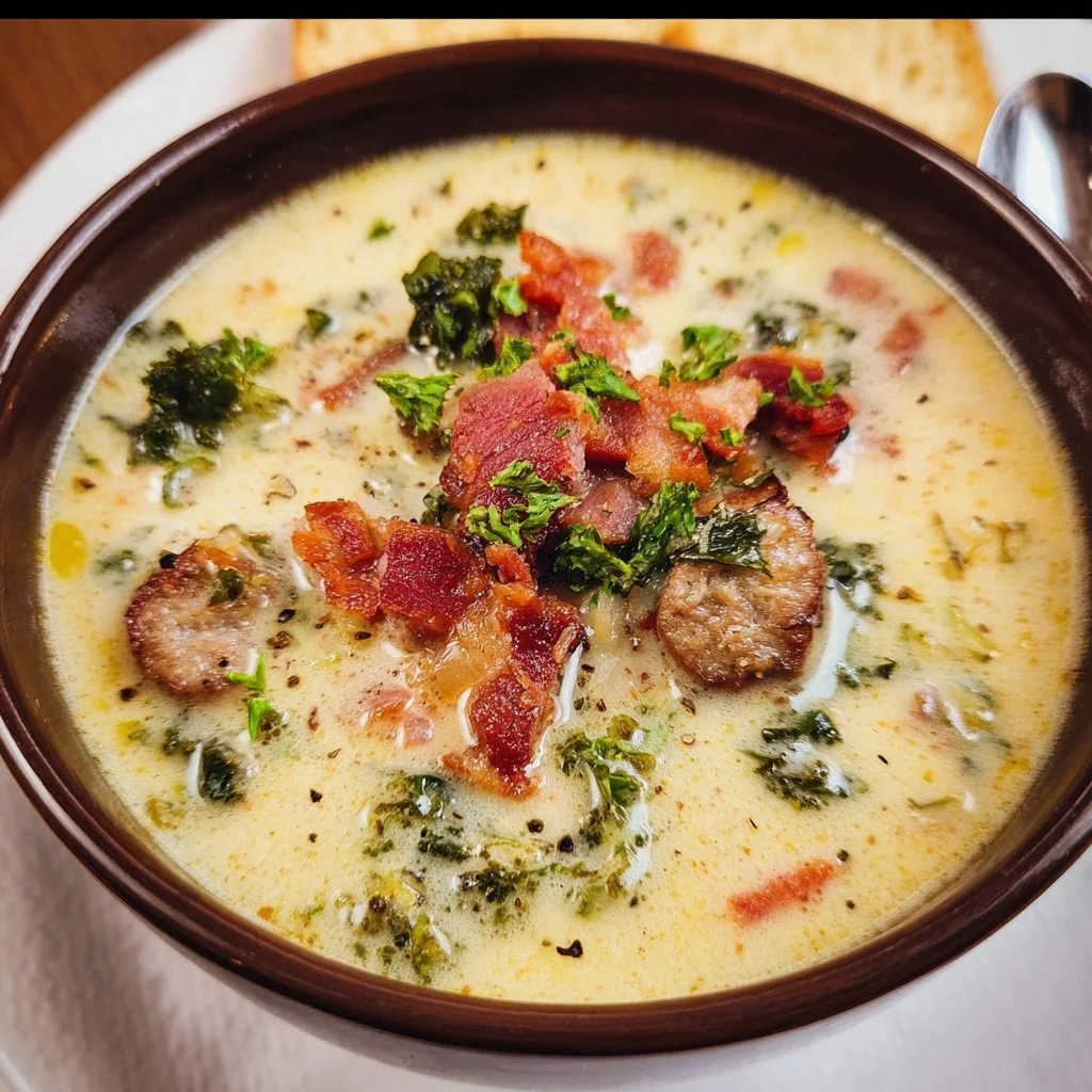 A comforting and satisfying creamy soup featuring Italian sausage, bacon, and fresh spinach and tomatoes, perfect for cold days.