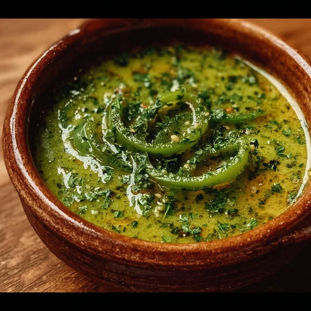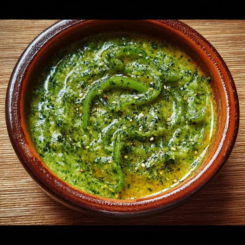 A bright and zesty green sauce made with roasted chiles, fresh tomatillos, and a touch of Salsa Ranchera, perfect as a dip or condiment.
