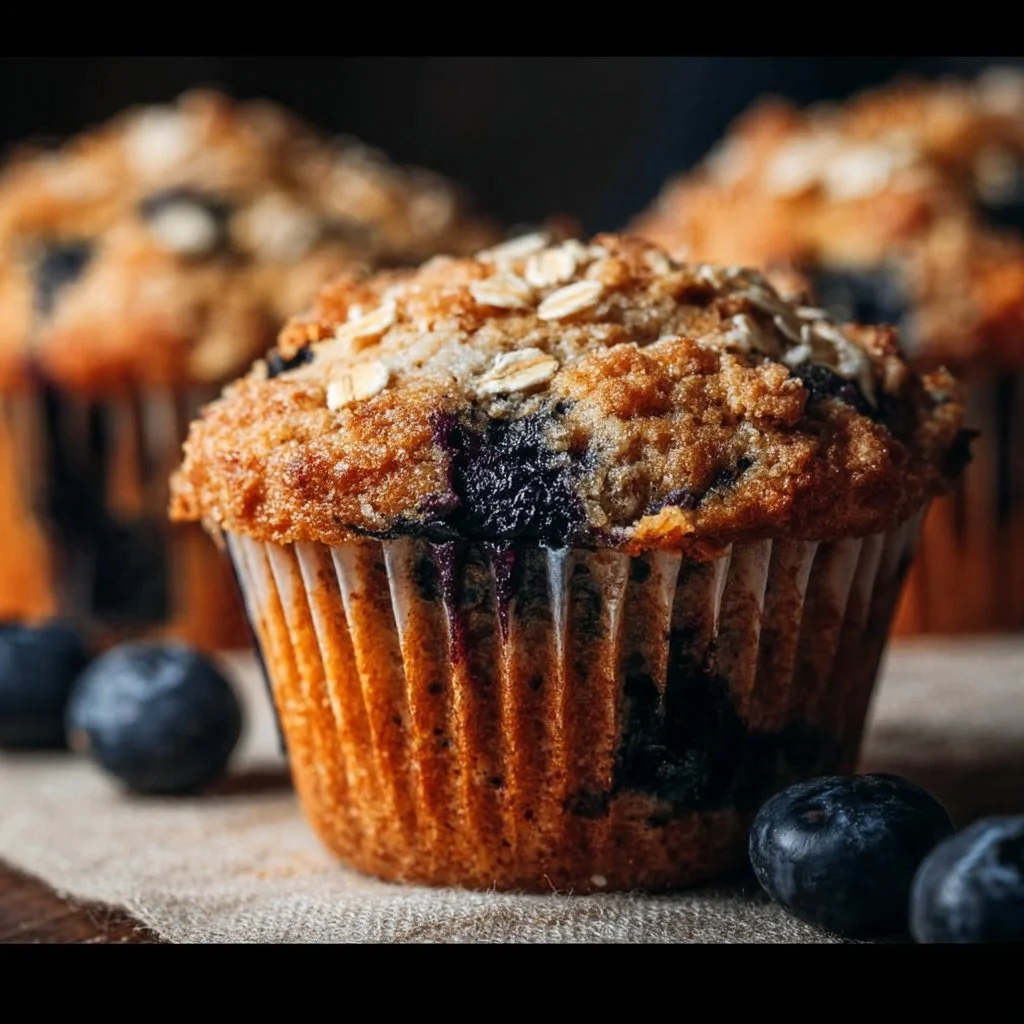 These nutritious muffins are made with rolled oats, whole wheat flour, and fresh blueberries, offering a healthy option for breakfast or snacks.