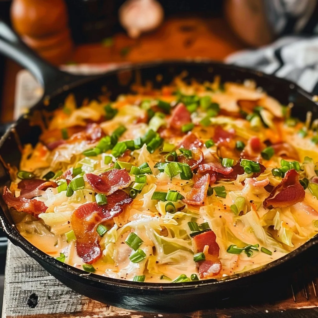 A quick and tasty low-carb dish featuring cabbage, bacon, cream, ranch mix, and cheese, perfect as a side or light dinner.