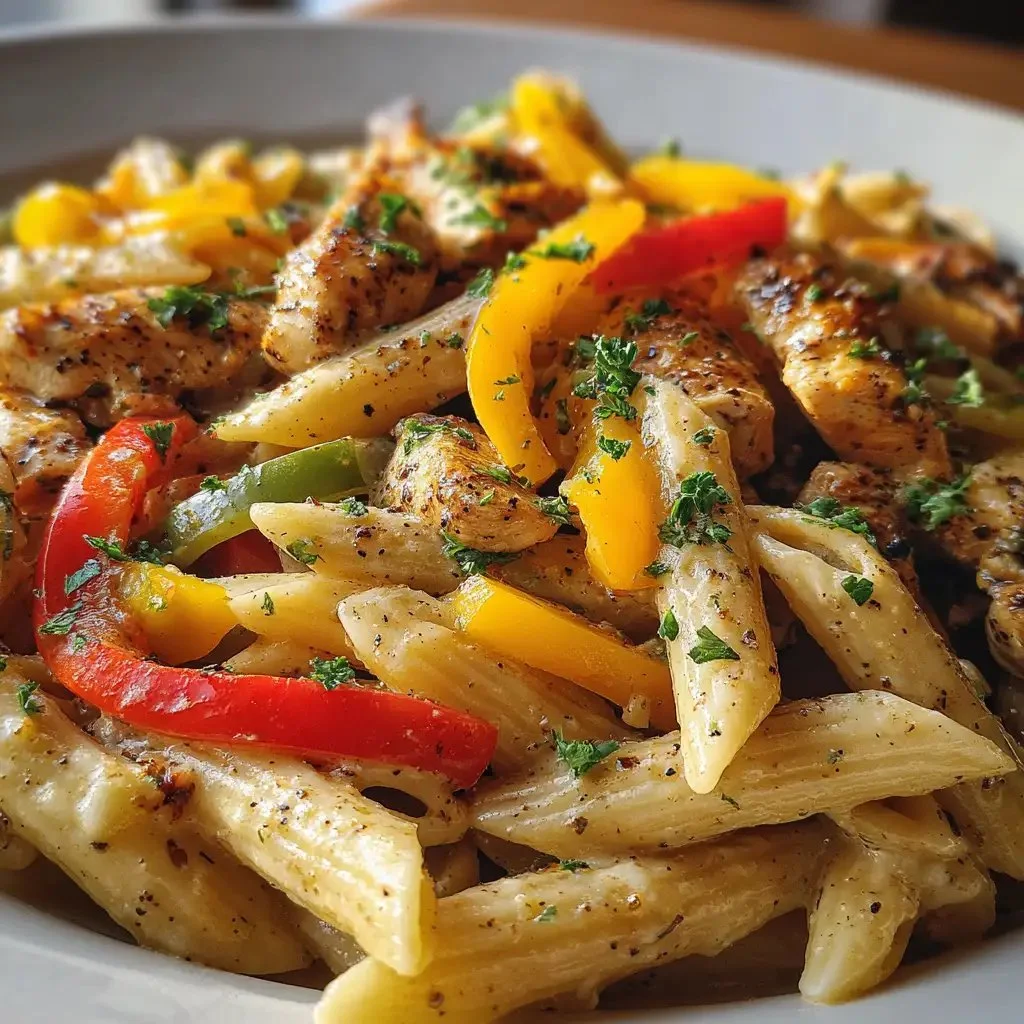 12 oz penne or rigatoni pasta, 2 tbsp olive oil, 3 bell peppers (red, yellow, green), sliced, 1 onion, sliced, 2 cloves garlic, minced, 1 cup heavy cream or coconut milk, ½ cup parmesan cheese or vegan substitute, 1 tsp jerk seasoning, Salt and pepper to taste, 2 chicken breasts or shrimp (optional)
