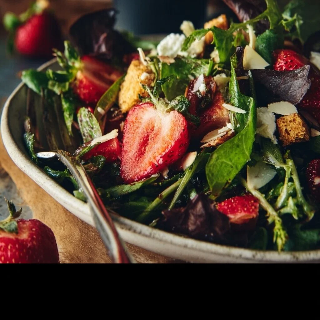 A bright and refreshing salad featuring sweet strawberries, crunchy almonds, and vibrant greens, perfect for spring.